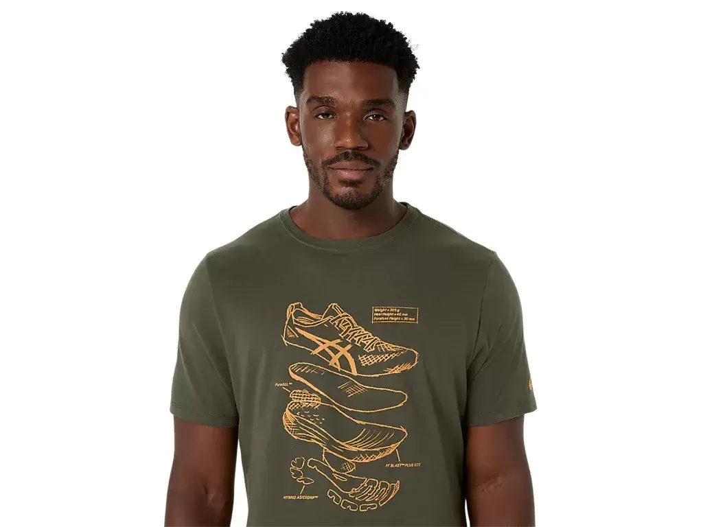 Ta wygodna dzianinowa koszulka z krótkim rękawem inspirowana jest szkicami butów do biegania ASICS. Z przodu znajduje się nadruk przedstawiający różne komponenty używane do produkcji naszych butów do biegania.