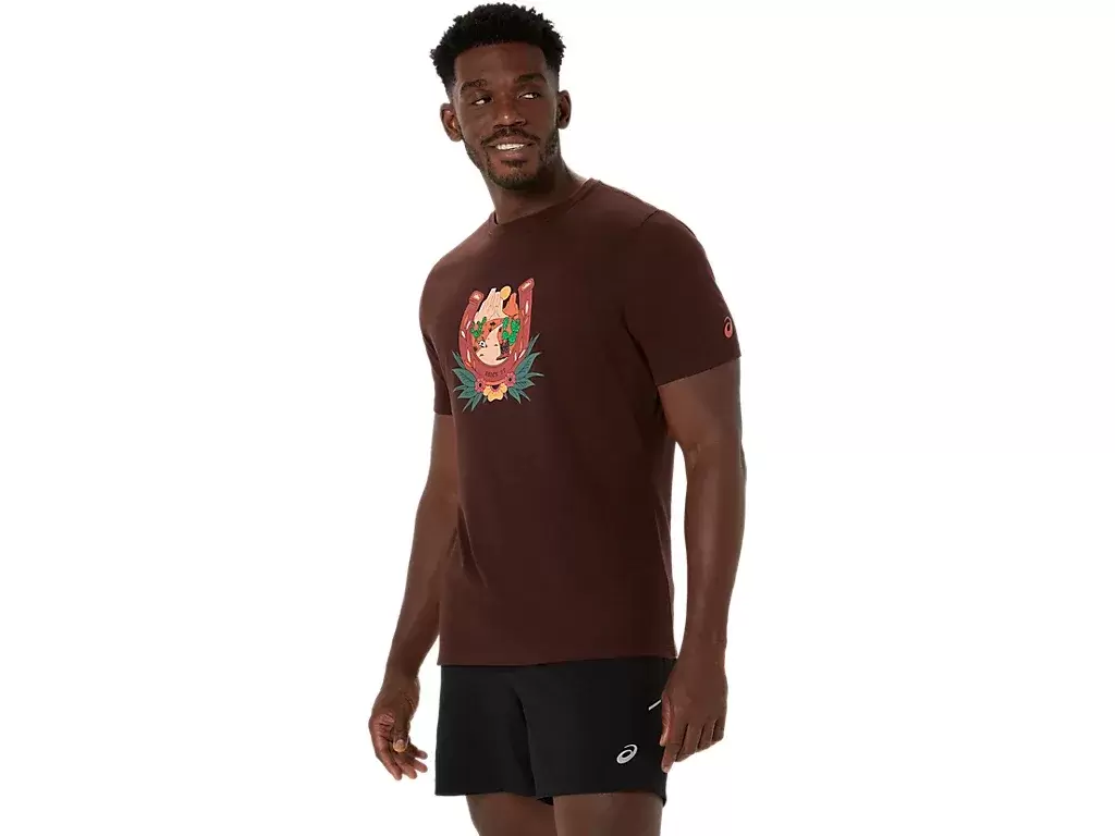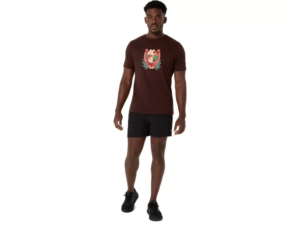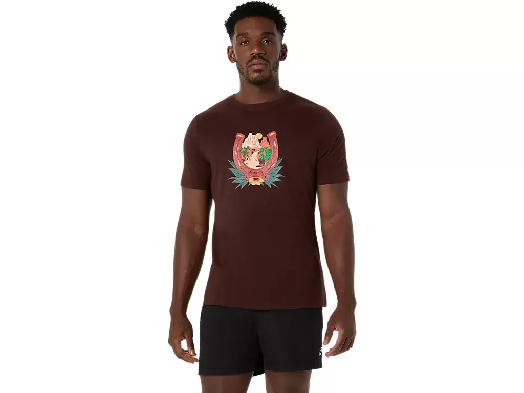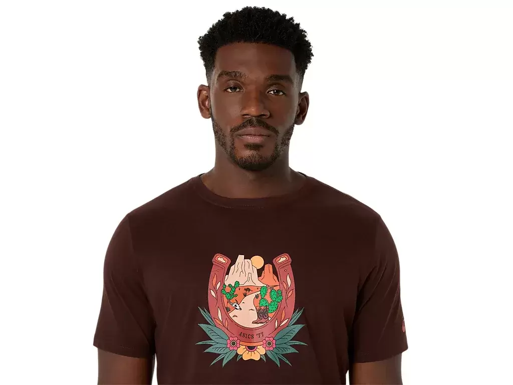 Ta wygodna dzianinowa koszulka z krótkim rękawem inspirowana jest pustynnym krajobrazem. Na klatce piersiowej znajduje się grafika przedstawiająca podkowę i górski zachód słońca.